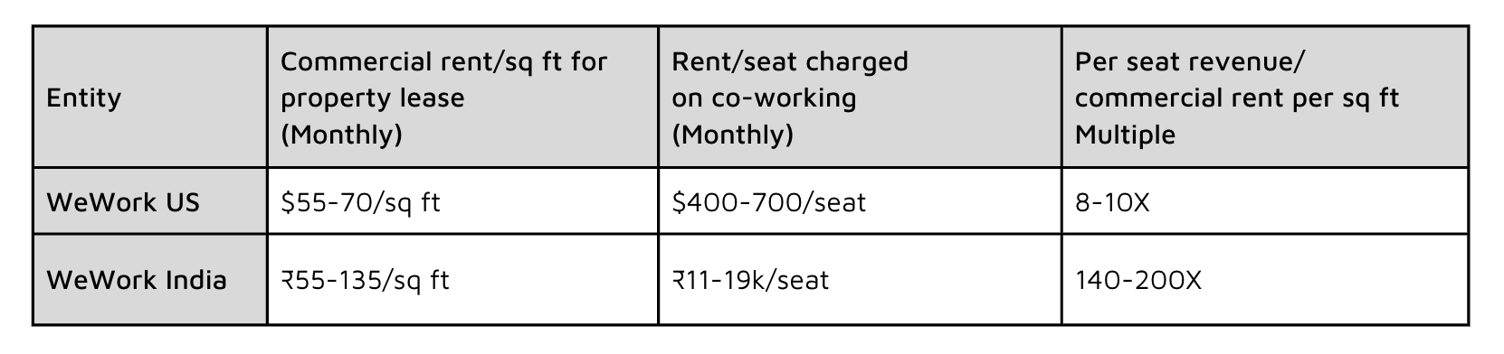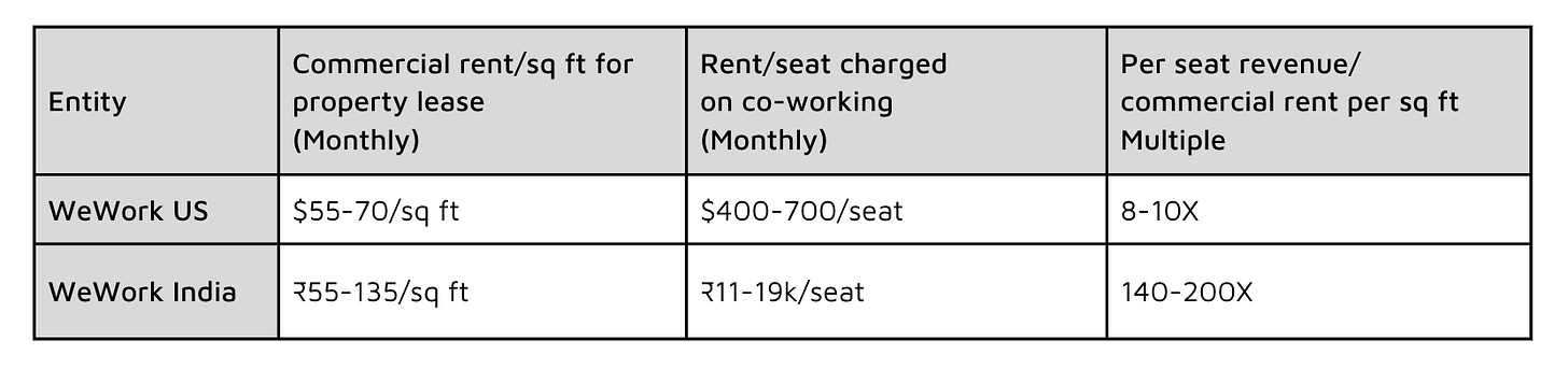 Per Sq ft and per seat business metrics: WeWork India clearly wins in the gross margins race. Even though other players in the Indian market are cheaper than WeWork India, WeWork’s premium positioning still attracts enough customers.